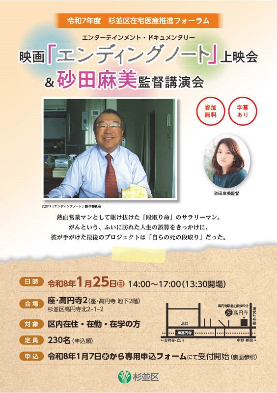 座・高円寺2令和7年度杉並区在宅医療推進フォーラム 映画「エンディングノート」上映会&砂田麻美監督講演会